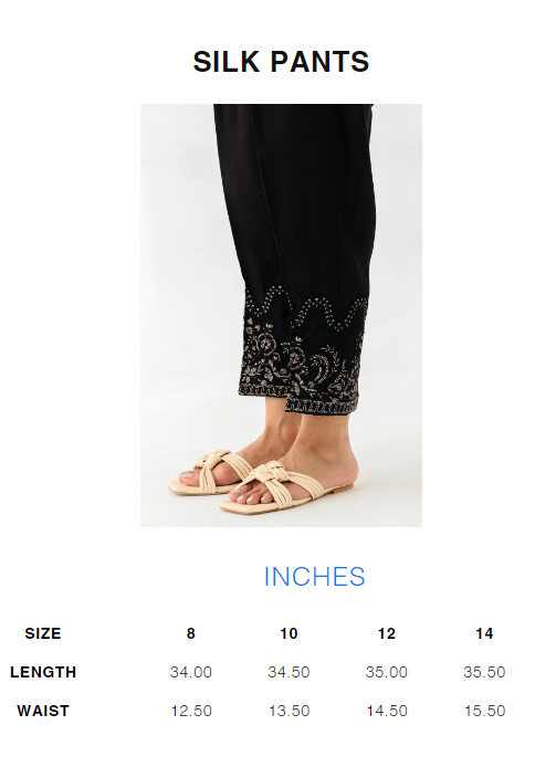 Buy Pakistani suits online in Canada with these luxurious black silk pants from Beechtree, featuring a raw silk fabric with an embroidered organza border and intricate tilla embroidery detail.